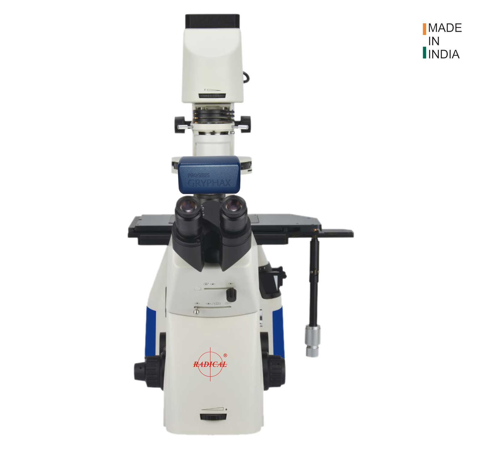 RTC-7NXF having NIS60 optical system features Retroverted illumination, coded nosepiece, turret phase, turret fluorescence, median lens, camera adaptor on both sides, etc is latest offering from the House of RADICAL is suitable for broad range of observation methods. In addition to conventional contrast, microscope is versatile in observation methods, including fluorescence, Phase Contrast, DIC, and Hoffman Modulation Contrast.