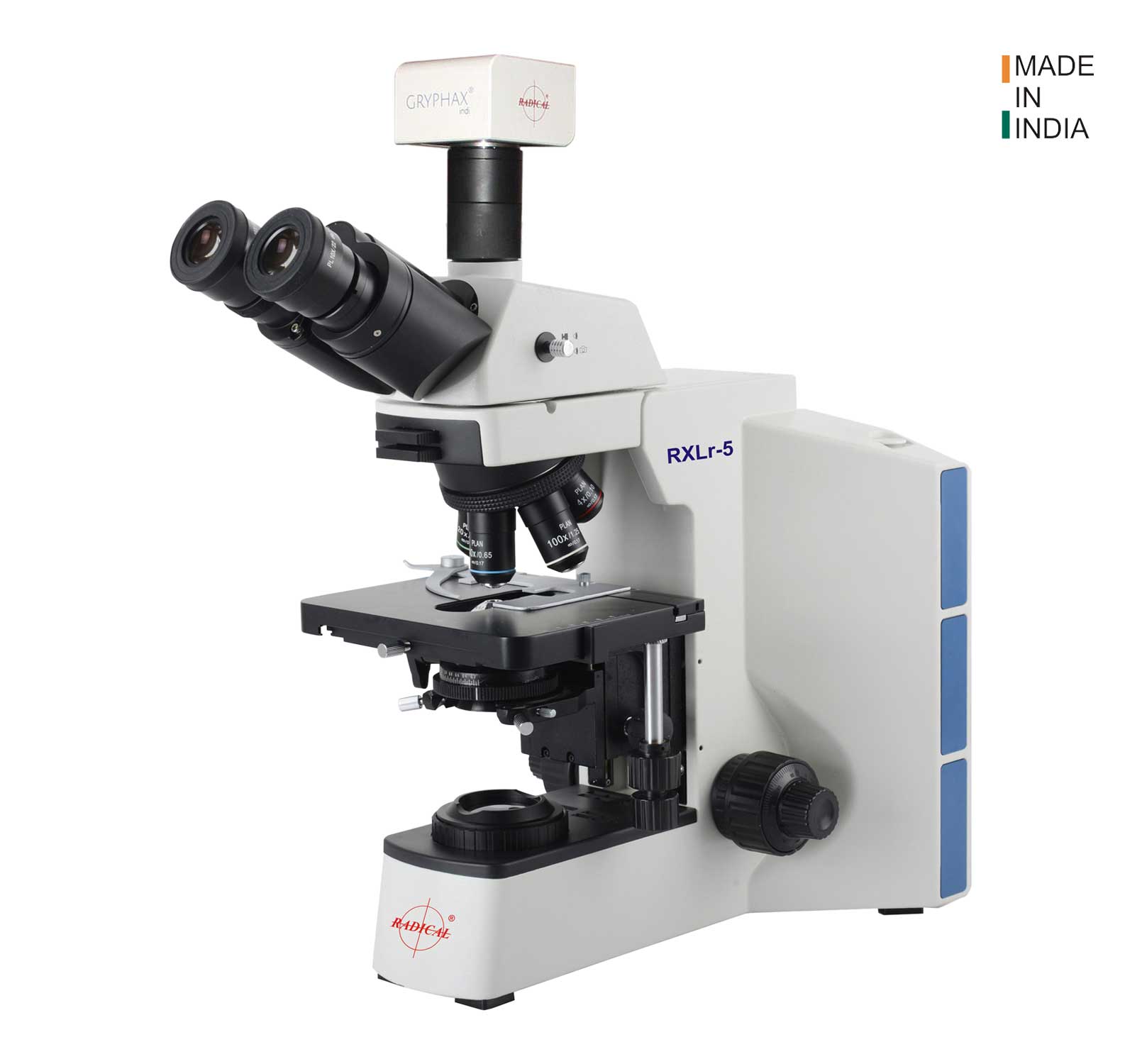 | RXR5CXMBia | Rugged, rigid, aluminium single die cast, sturdy, acid resistant texture painted, modular frame, ergonomic design, rust proof, anti-rust material, touch point treated,acid-proof painting, on/off switch (intensity adjustable), handle/grip on the back, rubber feet, extended Base, place for cable stow at back side with anti-theft security, slot for Ana/Pol/DIC, with slot for filters (on field lens), adjustable field diaphragm (provision to replace halogen with LED) inbuilt filter magazine for 3 filter DLF/N16/GF | |