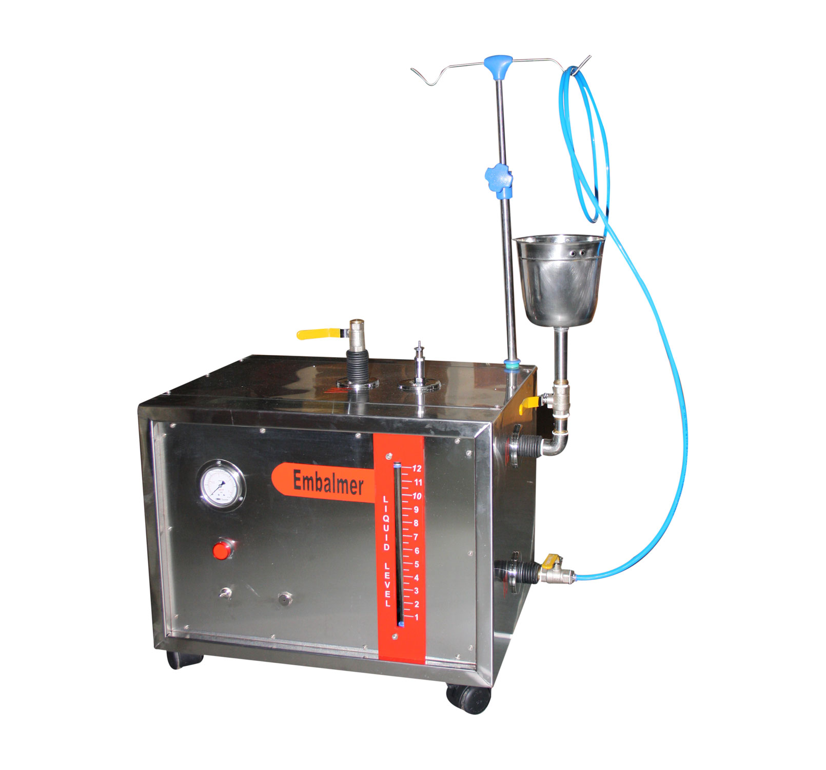 This is a completely silent & vibration free machine used for injecting Formaldehyde solution in Cadaverous at much higher speed than normal gravity process. The machine is mounted inside a covered cabinet fitted with castor wheels for ease in movement. The unit consists of an special reciprocator pressurizing unit which is connected with a Stainless Steel Tank of 10 liters capacity meant for storing the inject able solution.