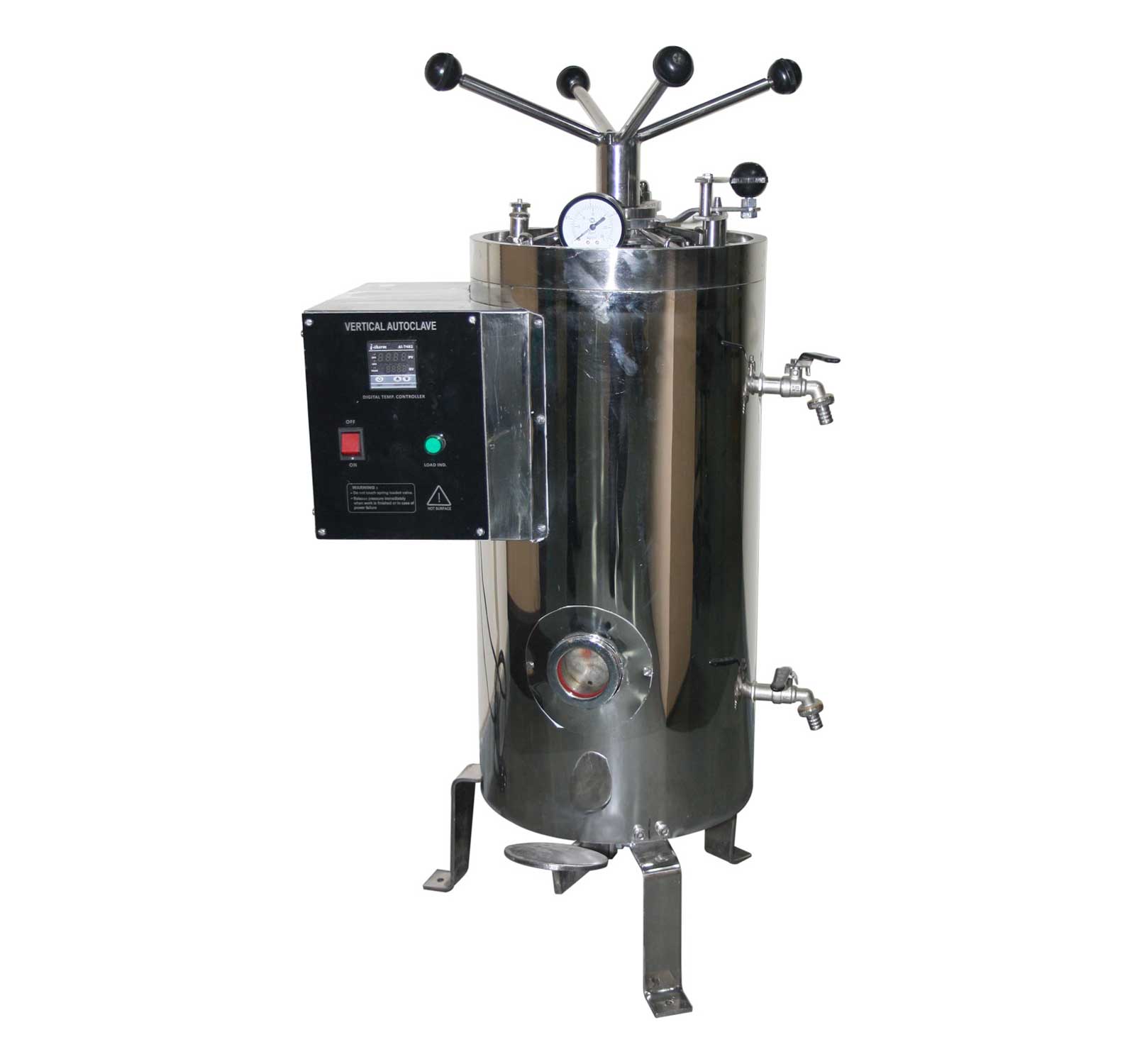 Vertical Radial locking Autoclave made using high grade stainless steel. Radial locking lid, incorporated with pressure Gauge, manual exhaust valve & water level indicator, makes sure that vertical radical locking autoclave is safe to use.